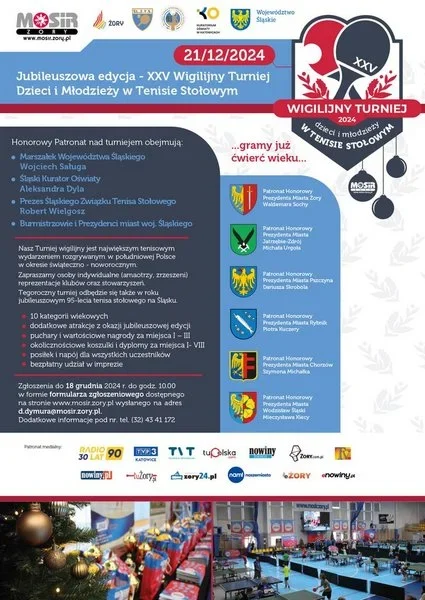 Miejski Ośrodek Sportu i Rekreacji w Żorach zaprasza na największe wydarzenie tenisowe! 21 grudnia odbędzie się jubileuszowy XXV Wigilijny Turniej Dzieci i Młodzieży w Tenisie Stołowym. Zgodnie z przyjętą ideą, celem turnieju jest wypełnianie wolnego czasu dzieci i młodzieży w okresie pomiędzy Świętami a Nowym Rokiem.