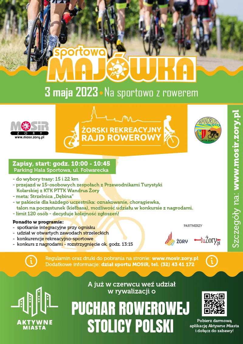 W ramach Sportowej Majówki MOSiR Żory oraz Klub Kolarski PTTK „Wandrus” zapraszają w środę 3 maja br. na Żorski Rekreacyjny Rajd Rowerowy. W tym dniu miłośnicy „dwukółek” będą mieli możliwość wyboru dwóch tras; krótszej na dystansie 15 km oraz dłuższej – 22 km.