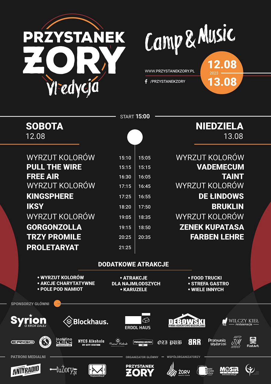 W niedzielę 13 sierpnia na żorskiej scenie od godziny 15:00 zagrają zespoły: Vademecum, Taint, De Łindows, Bruklin oraz Zenek Kupatas. Gwiazdą wieczoru będzie zespół Farben Lehre.