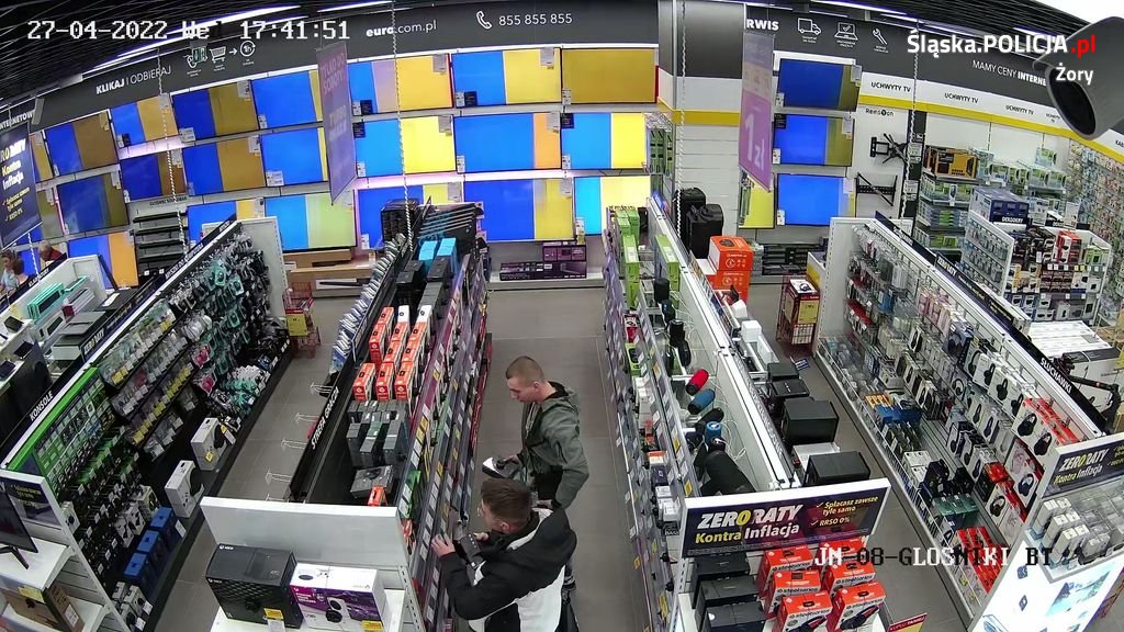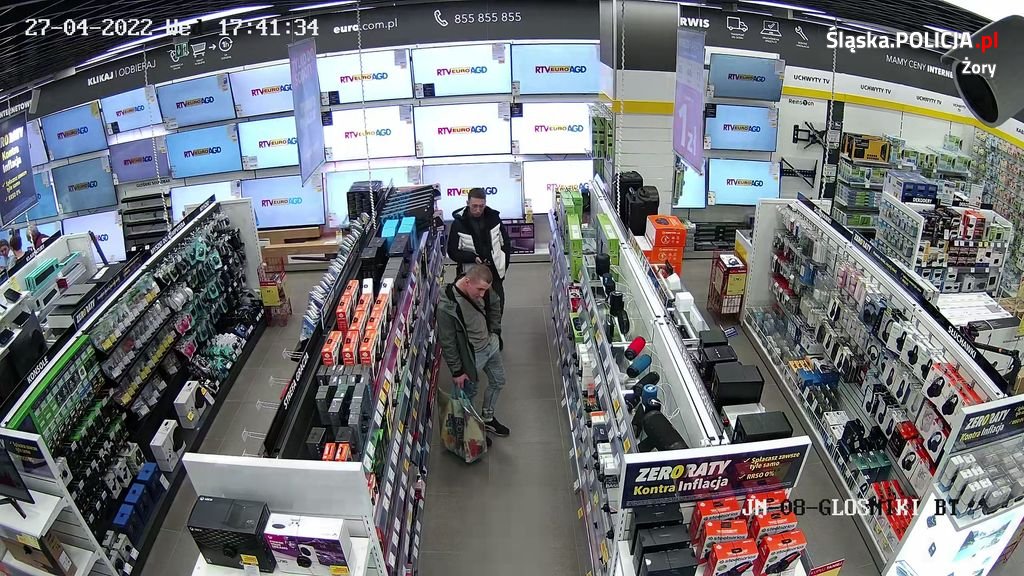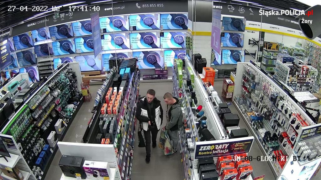 Mężczyźni, których zarejestrowały kamery monitoringu, podejrzewani są o dokonanie w dniu 27.04.2022 roku kradzieży towaru elektronicznego o wartości 2644,99 złotych ze sklepu RTV-EURO-AGD na terenie Galerii Wiślanka przy ul. Katowickiej 10.