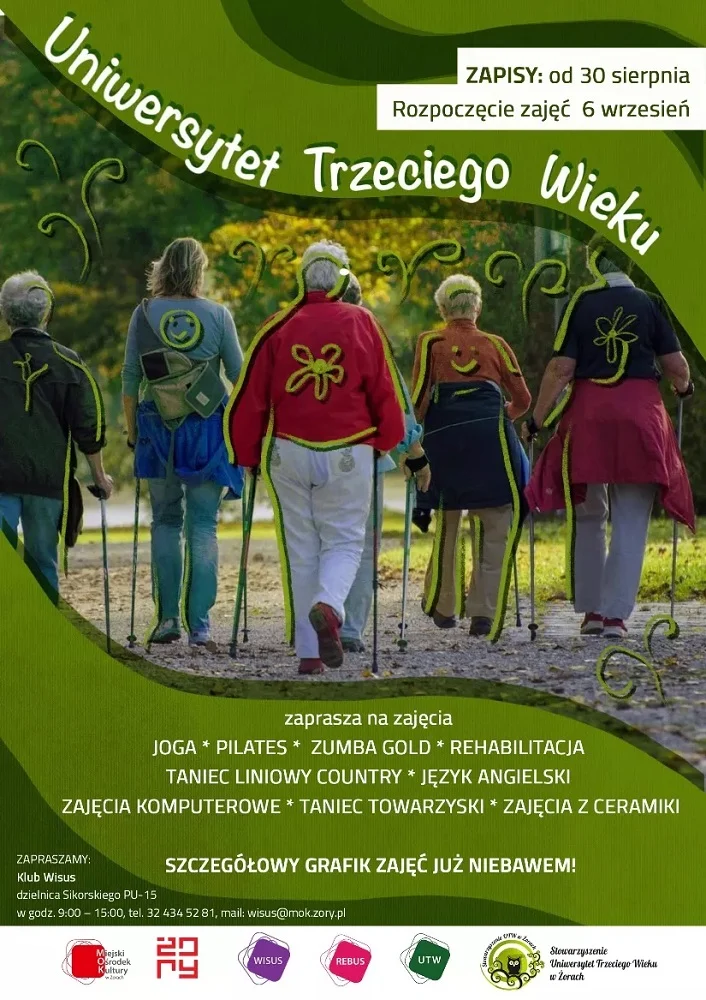 Od 30 sierpnia, każdy senior mieszkających w Żorach będzie miał możliwość zapisania się i wzięcia udziału w kompletnych pakietach zajęć, które poprowadzą wykwalifikowani instruktorzy. Oferta przygotowana została przez Stowarzyszenie Uniwersytetu Trzeciego Wieku w Żorach we współpracy z Miejskim Ośrodkiem Kultury w Żorach. Od tego roku obie organizacjepodpisały porozumienie o współpracy, a koordynacją zajęć stałych UTW zajmie się Klub Wisus.