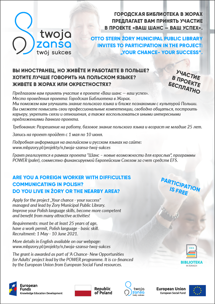 Apply to project ‘Your chance- your success’ managed and lead by Żory Municipal Public Library. Improve your Polish language skills, become more competent and benefit from many attractive activities!