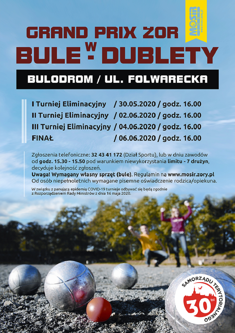 Miejski Ośrodek Sportu i Rekreacji w Żorach zaprasza do wzięcia udziału w zawodach w bule. Grand Prix odbędzie się na bulodromie w Parku Cegielnia, przy ul. Folwareckiej. Imprezę podzielono na etapy, w celu zachowania obowiązujących zasad bezpieczeństwa.