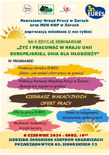 Seminarium pn. „Żyć i pracować w kraju Unii Europejskiej, Unia dla młodzieży” to wspólna inicjatywa Powiatowego Urzędu Pracy i Młodzieżowego Centrum Kariery OHP, zorganizowana w celu promowania informacji na temat pośrednictwa pracy w sieci EURES (EURopean Employment Services) oraz bezpieczeństwa podczas wyjazdów za granicę.