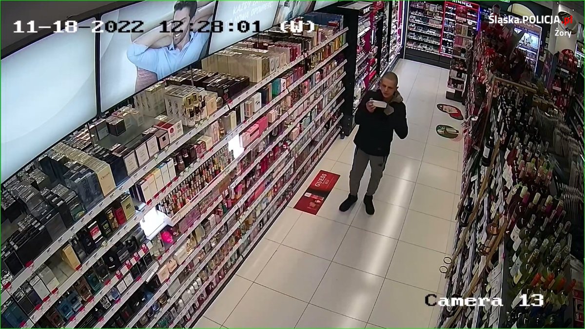 Następną osobą jest mężczyzna podejrzewany o dokonanie kradzieży perfum o łącznej wartości ponad 700 złotych, w dniu 18 listopada 2022 roku w sklepie Rossmann przy ulicy Katowickiej w Żorach.