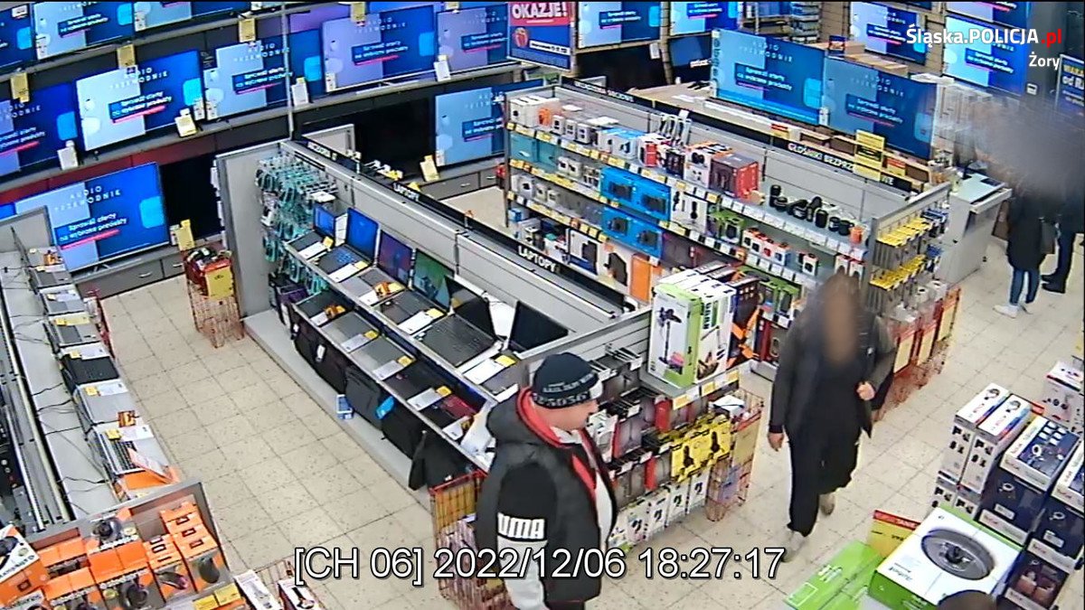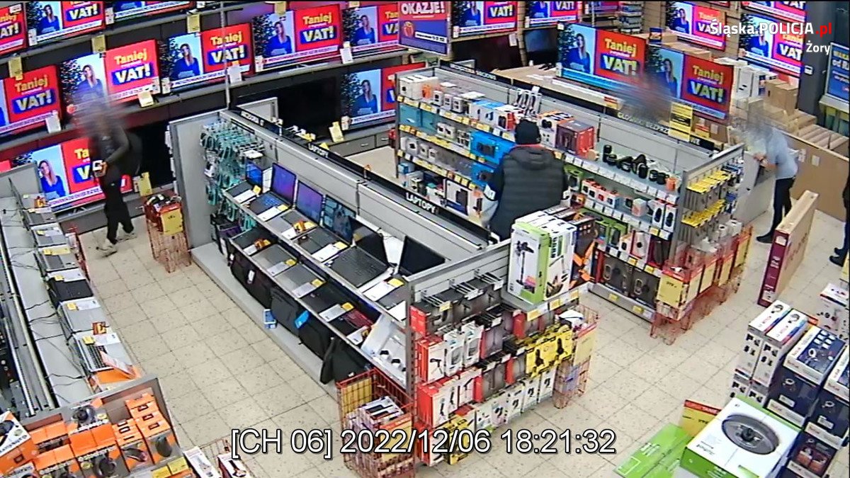 Kolejną osobą jest mężczyzna podejrzewany o dokonanie kradzieży głośników bezprzewodowych o łącznej wartości prawie 700 złotych, w dniu 6 grudnia 2022 roku w sklepie TV Euro AGD przy al. Jana Pawła II w Żorach.