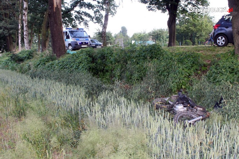 Do zdarzenia doszło przed godziną 6.00, na ulicy Owocowej w Żorach. Jak wstępnie ustalili policjanci, 38-letni kierowca motocykla na łuku drogi wyprzedzał samochód osobowy. Nagle, z naprzeciwka zaczął nadjeżdżać inny pojazd i 38-latek, najprawdopodobniej chcąc uniknąć zderzenia z nim gwałtownie skręcił w prawą stronę. Mężczyzna stracił panowanie nad kierownicą i uderzył w przydrożne drzewo.