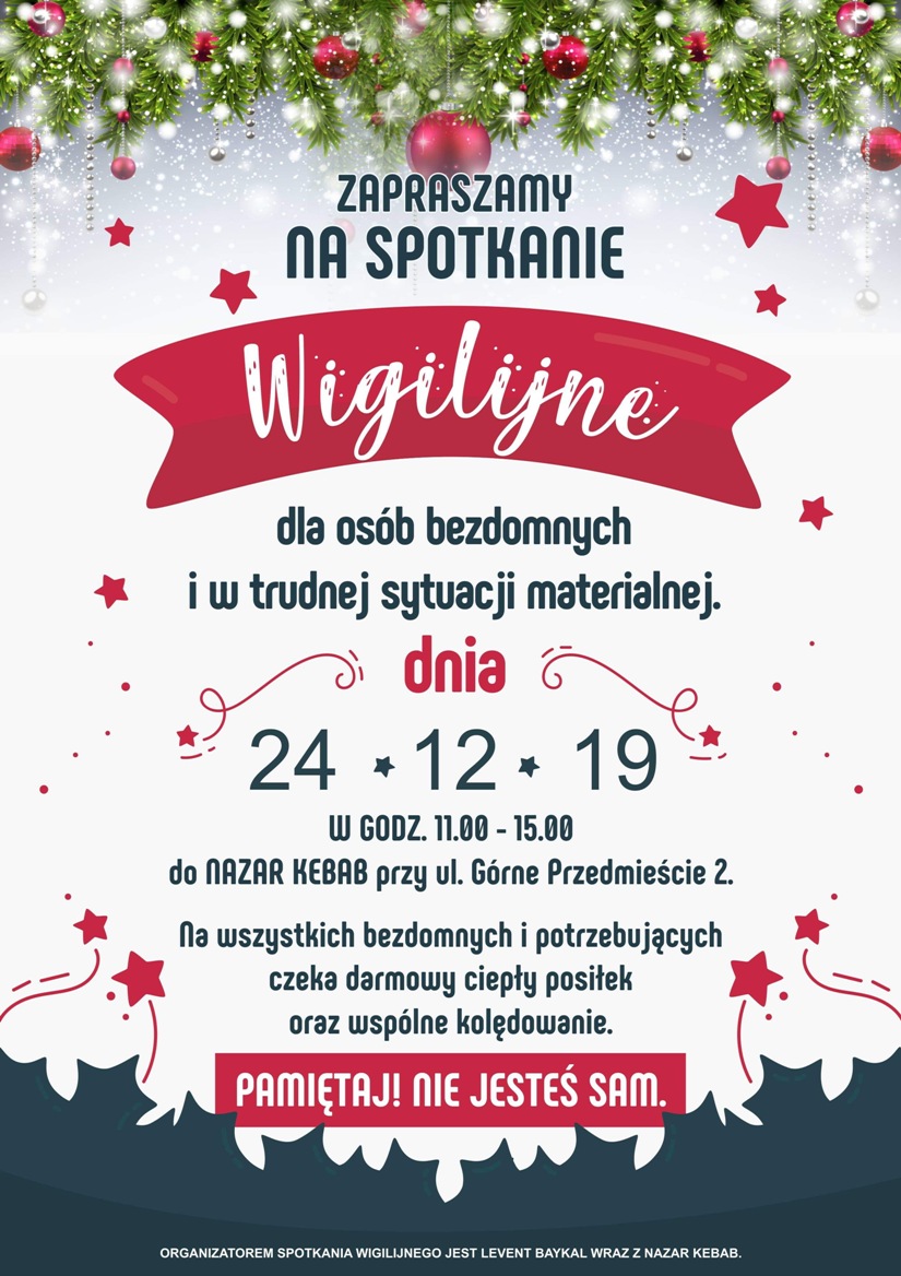 Spotkanie odbędzie się w Wigilię Bożego Narodzenia tj. wtorek, 24 grudnia w godzinach 11:00 – 15:00, obok siedziby Nazar Kebab, przy ul. Dolne Przedmieście 2 w Żorach. W trakcie tego wydarzenia wszyscy potrzebujący będą mogli zjeść darmowy ciepły posiłek w świątecznej atmosferze oraz wspólnie zaśpiewać kolędy.