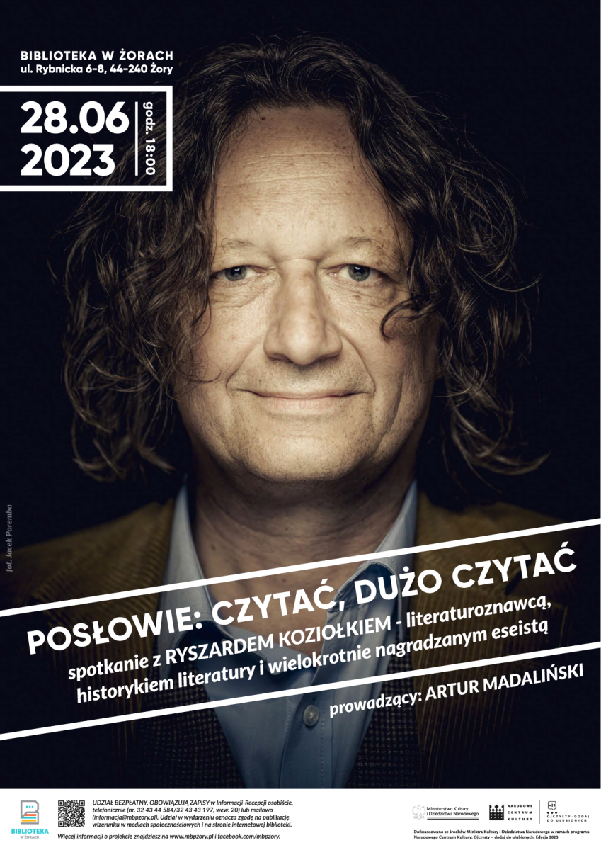 Miejska Biblioteka Publiczna w Żorach zaprasza na spotkanie z prof. dr hab. Ryszardem Koziołkiem, które odbędzie się 28 czerwca o godzinie 18:00, apoprowadzi je Artur Madaliński.