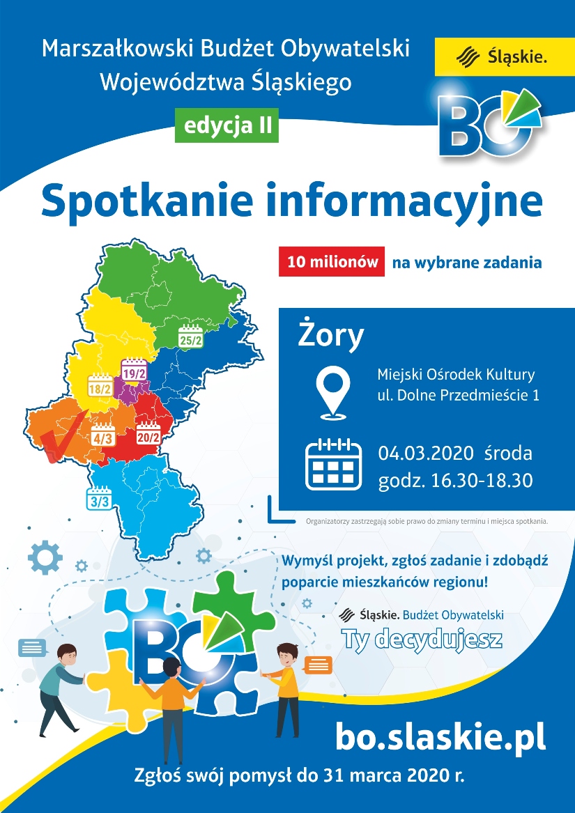 Spotkanie informacyjne odbędzie się w środę, 4 marca w godz. 16:30 – 18:30 w Miejskim Ośrodku Kultury w Żorach, przy ul. Dolne Przedmieście 1. Łącznie w Marszałkowskim Budżecie Obywatelskim do dyspozycji mieszkańców województwa będzie aż 10 milionów złotych! Pula na zadania wojewódzkie wynosi 2,5 miliona złotych, a kolejne 7,5 miliona przeznaczono na zadania podregionalne. Żory wchodzą w skład podregionu nr 3 wraz z powiatami: mikołowskim, raciborskim, rybnickim, wodzisławskim oraz miastami: Jastrzębie-Zdrój i Rybnik. W tym podregionie pula do rozdysponowania wynosi 1,2 mln zł.