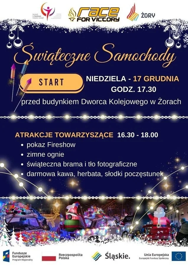 Miłośnicy samochodowego tuningu – członkowie Stowarzyszenia Race for Victory zorganizują świąteczny przejazd po Żorach, podczas którego zaprezentują mieszkańcom bożonarodzeniowe dekoracje swoich samochodów. Pojazdy będą rozświetlone tysiącami lampek, ozdobione łańcuchami i innymi świątecznymi motywami.