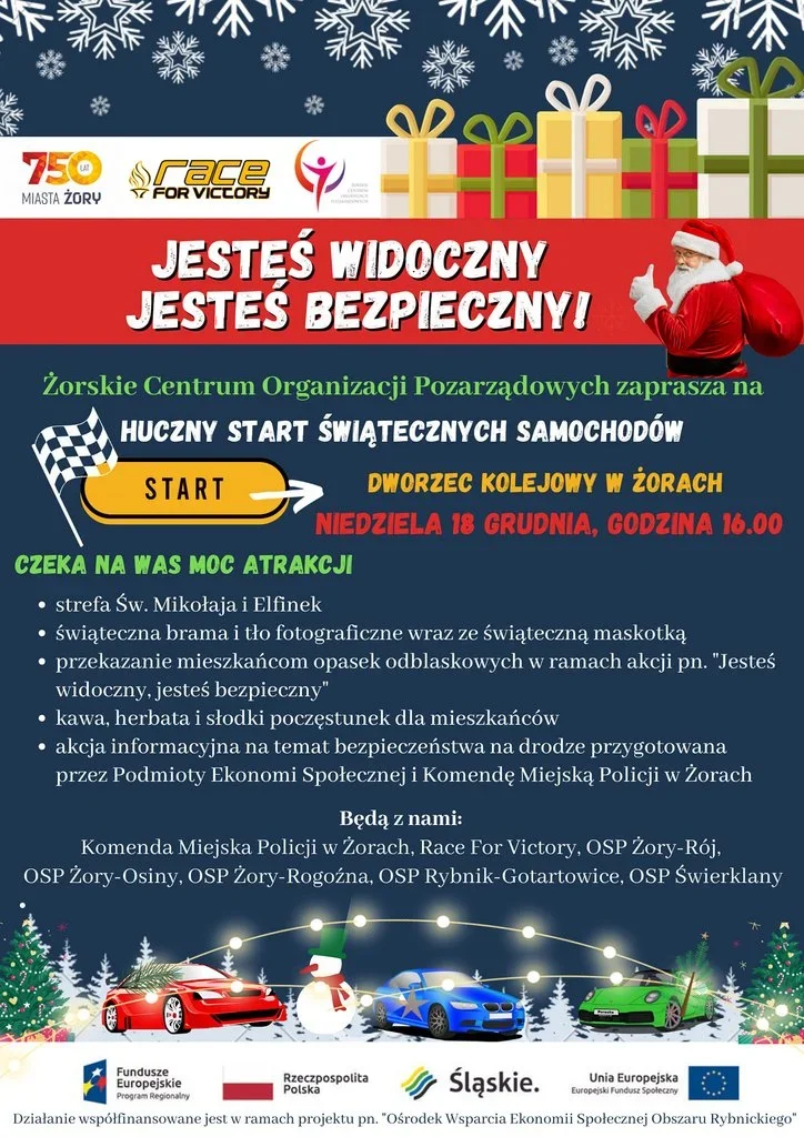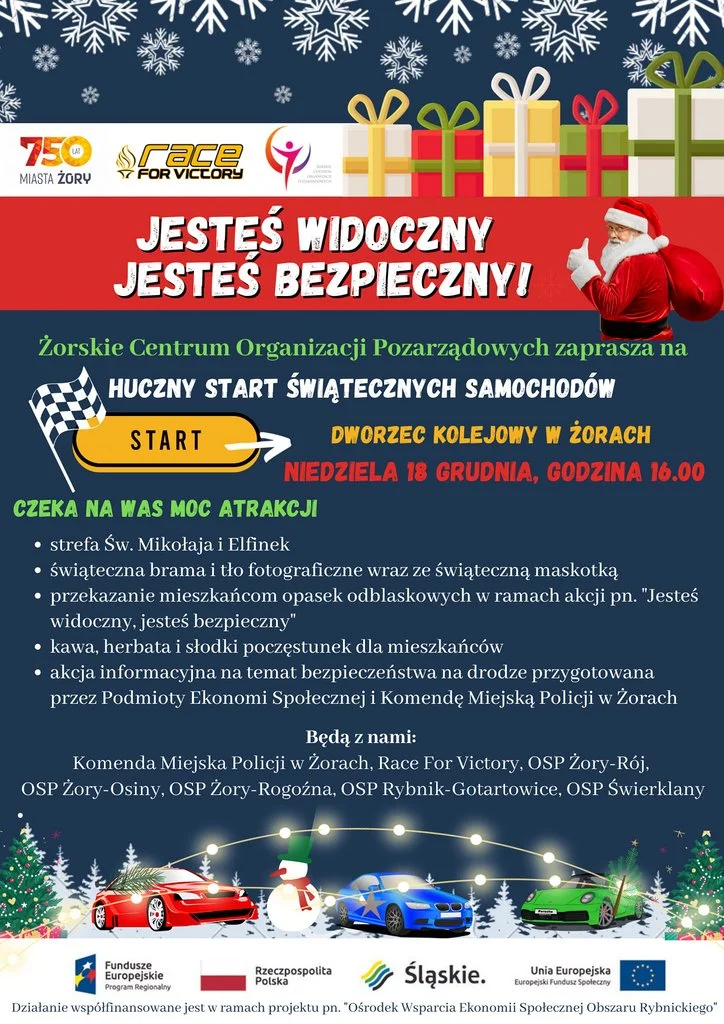 W niedzielę, 18 grudnia o godzinie 16:00, rozpocznie się tam wydarzenie pod hasłem „Jesteś widoczny, jesteś bezpieczny!”. Na wszystkich uczestników będączekały: strefa Świętego Mikołaja i Elfinek, świąteczna brama i tło fotograficzne oraz kawa, herbata i słodki poczęstunek. Będzie też można otrzymać opaski odblaskowe oraz odświeżyć informacje o bezpieczeństwie na drodze – zadbają o to funkcjonariusze Komendy Miejskiej Policji wŻorach.