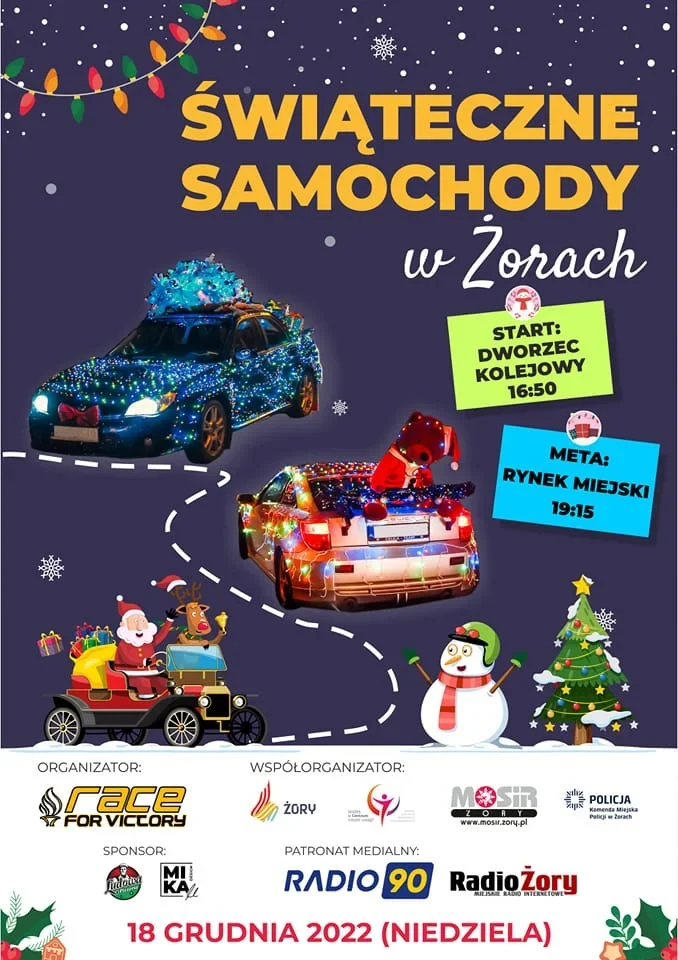 Rozświetlone tysiącami lampek, ozdobione łańcuchami i innymi świątecznymi motywami auta ponownie przejadą przez Żory! Już po raz trzeci w naszym mieście zagoszczą Świąteczne Samochody – niezwykłe wydarzenie, organizowane przez Stowarzyszenie Race For Victory.