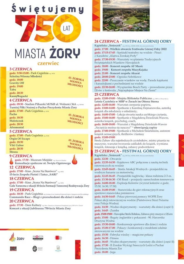 Trwają obchody wyjątkowego jubileuszu, jakim jest 750. rocznica założenia Miasta Żory! Czerwcowe świętowanie rozpocznie długo wyczekiwana Żorska Wiosna Młodości, a zakończy Festiwal Górnej Odry na żorskim Śmieszku. Zapowiada się fantastyczny począteklata!