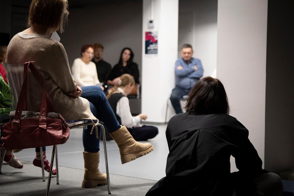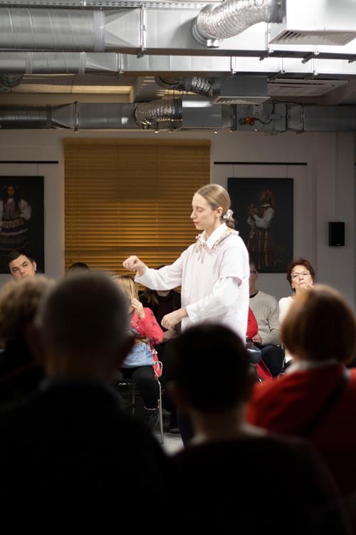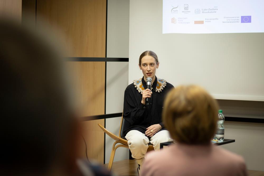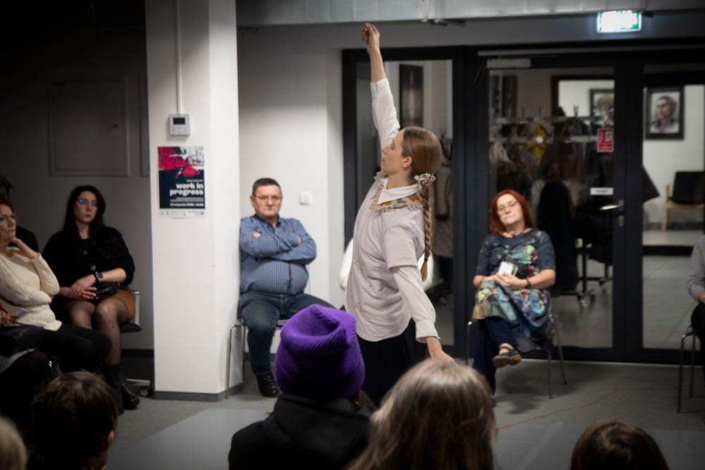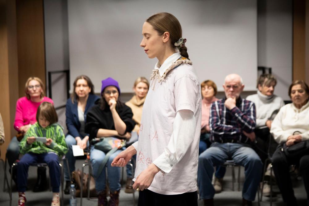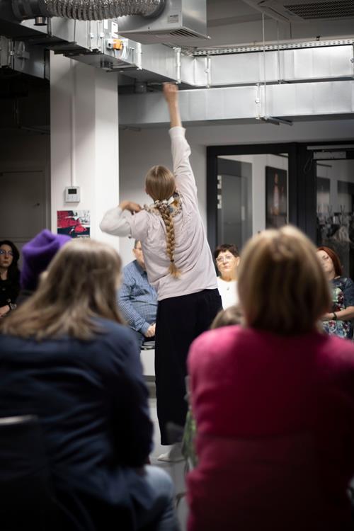 Trzecim elementem była rozmowa z artystką, prowadzona przez pomysłodawczynię projektu, Magdę Garlińską. Dyskusja szybko przerodziła się w otwarte spotkanie – publiczność aktywnie włączała się, dzieląc się interpretacjami, refleksjami i pytaniami. W efekcie finał rezydencji stał się wspólnym doświadczeniem procesu twórczego, a nie tylko pokazem „gotowego dzieła”.