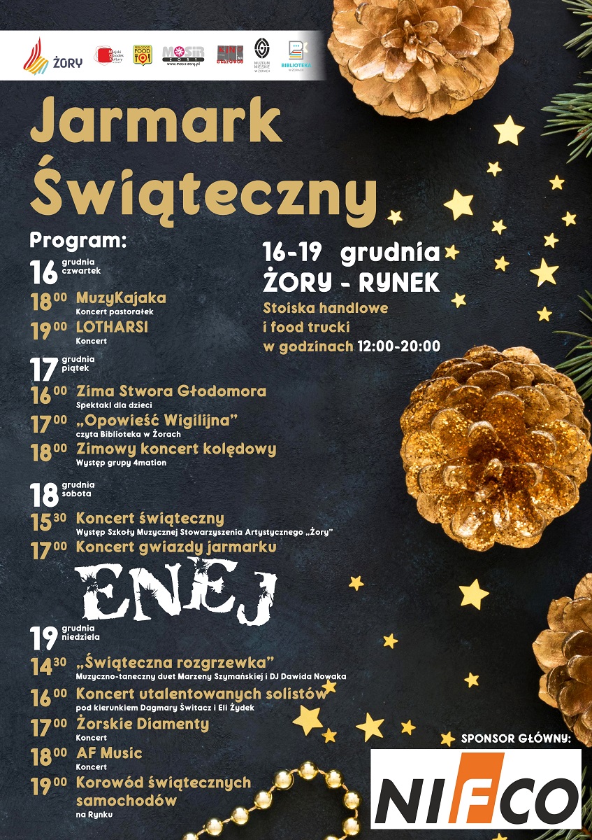 Żorski Rynek zmienił się w pełny atrakcji, zapachów, smaków i niezwykłej atmosfery Jarmark Świąteczny! To doskonała okazja, by kupić oryginalne prezenty świąteczne i ozdoby, zjeść smakołyki serwowane przez food trucki oraz miło spędzić czas z bliskimi podczas ciekawych występów artystycznych. Gwiazdą żorskiego Jarmarku Świątecznego będzie zespół ENEJ!