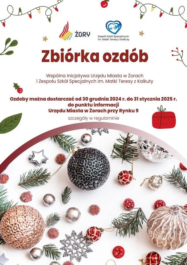 Zachęcamy wszystkich mieszkańców do wzięcia udziału w zbiórce ozdób i wsparcia wspólnej inicjatywy Urzędu Miasta w Żorach i Zespołu Szkół Specjalnych im. Matki Teresy z Kalkuty. Razem możemy przyczynić się do zmniejszenia ilości odpadów komunalnych i stworzenia pięknych, ekologicznych dekoracji, które będą ozdobą naszych domów i miejsc publicznych.