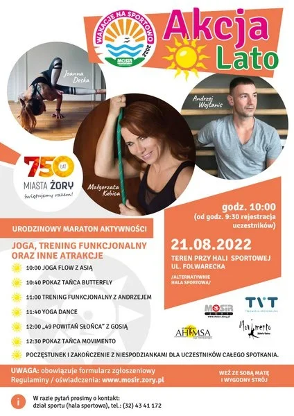 W niedzielę, 21 sierpnia na terenie przy hali sportowej MOSiR Żory przy ul. Folwareckiej 10 odbędzie się „Urodzinowy Maraton Aktywności”. Impreza rozpocznie się o godz. 10:00, a rejestracja uczestników odbędzie się w godzinach 9:15 – 9:45.