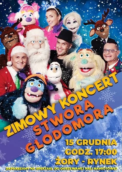 Spektakl pt. „Zima Stwora Głodomora” to pełna humoru opowieść o zimie, świętach Bożego Narodzenia i Świętym Mikołaju. W trakcie przedstawienia usłyszymy największe świąteczno-zimowe przeboje, śpiewane przez grupę wokalną 4MATION, której członkowie są finalistami programu „Szansa na Sukces” oraz wielu festiwali i przeglądów muzycznych. Do świata niezwykle barwnych i rozgadanych muppetów zaprosi Was Konrad „Kony” Czarkowski – lalkarz medialny, finalista Mam Talent i półfinalista Britain’s Got Talent, twórca lalek do programów dla dzieci, a także filmu „Planeta Singli”.