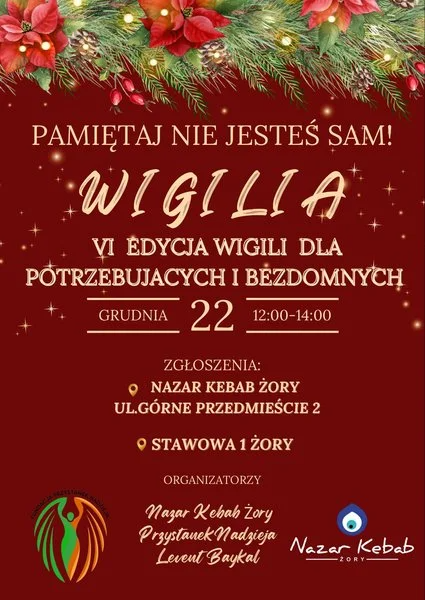 Jeśli sam jesteś w potrzebie lub znasz kogoś w potrzebie, możesz zapisać się na wigilijne spotkanie w siedzibie Fundacji Przystanek Nadzieja przy ul. Stawowej 1 oraz w lokalu Nazar Kebab Żory, przy ul. Górne Przedmieście 2. Zapisy trwają do 15 grudnia.