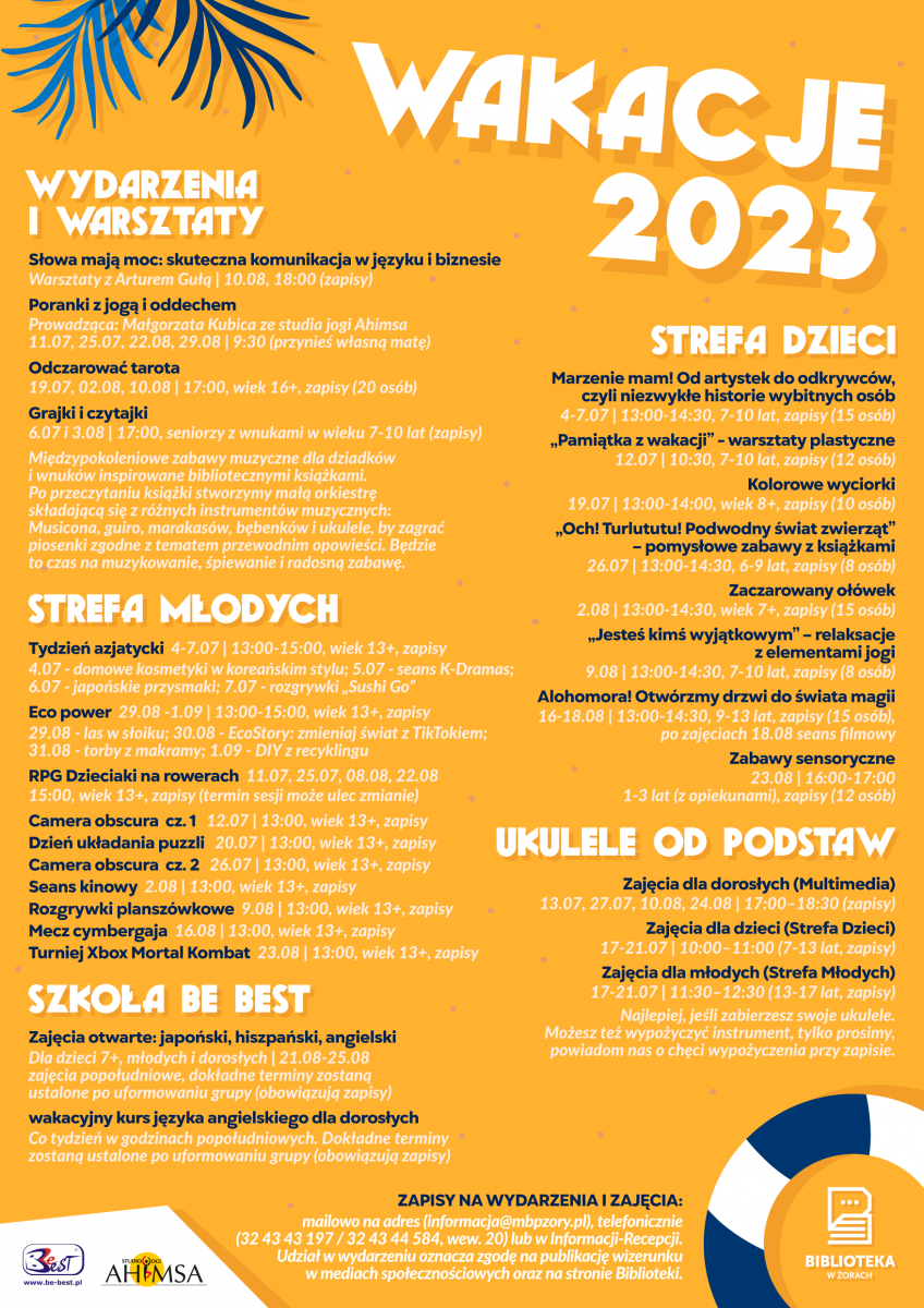 Wakacje w bibliotece? Pewnie! Miejska Biblioteka Publiczna w Żorach przygotowała ciekawe zajęcia. Zaprasza na warsztaty rozwijające różne pasje: językowe, sportowe, artystyczne, międzykulturowe, ekologiczne i inne. Zajęcia są bezpłatne – obowiązują zapisy! Szczegóły w poniższym harmonogramie: