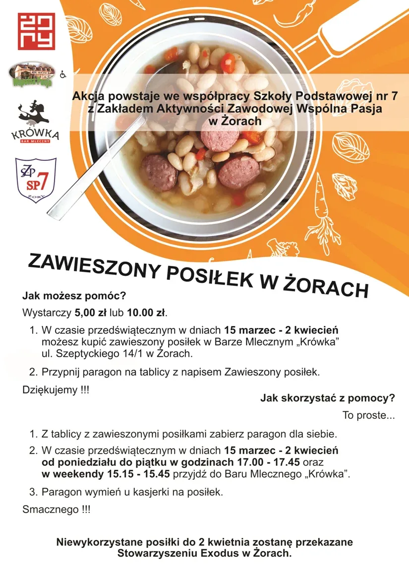 Chcesz w przedświątecznym czasie pomóc osobom potrzebującym? Weź udział we wspólnej akcji Szkoły Podstawowej nr 7 oraz Zakładu Aktywności Zawodowej „Wspólna Pasja” w Żorach i kup tzw. „posiłek zawieszony” w Barze Mlecznym „Krówka”.