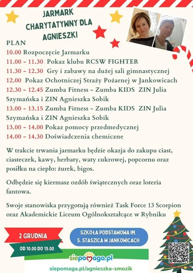 Warto wspomnieć, że środki na leczenie żorzanki będą zbierane także podczas Jarmarku Charytatywnego, który już 2 grudnia w godzinach od 10:00 do 15:00 odbędzie się w Szkole Podstawowej w Jankowicach Rybnickich. Miłośnicy Śląskiej Listy Przebojów powinni zaś wybrać się na Koncert Charytatywny, który 10 grudnia o godz. 17:00 odbędzie się w sali bankietowej GOKiR w Świerklanach. Wystąpią: Harmonic, Tomasz Gołowacz oraz Dynamic.