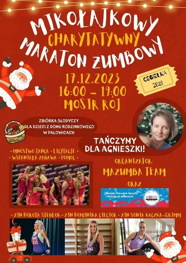 Dlatego też przyjaciele i rodzina Agnieszki organizują wydarzenia charytatywne, z których dochód przeznaczony będzie na leczenie żorzanki. Już w niedzielę, 17 grudnia w budynku MOSiR Żory przy ul. Wodzisławskiej 213 w Roju (siedziba LKS Rój) odbędzie się Mikołajkowy Charytatywny Maraton Zumbowy. Impreza rozpocznie się o godz. 16:00 a zajęcia poprowadzą instruktorki Mazumba Team: Dorota Steblok, Dominika Ciecior oraz Sonia Kaczka-Grimm. Biletem wstępu jest symboliczna „cegiełka” w wysokości 20 zł, a kwota ta w całości przeznaczona zostanie na leczenie Agnieszki Smozik.