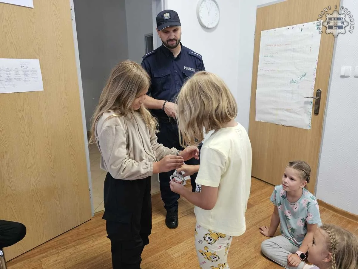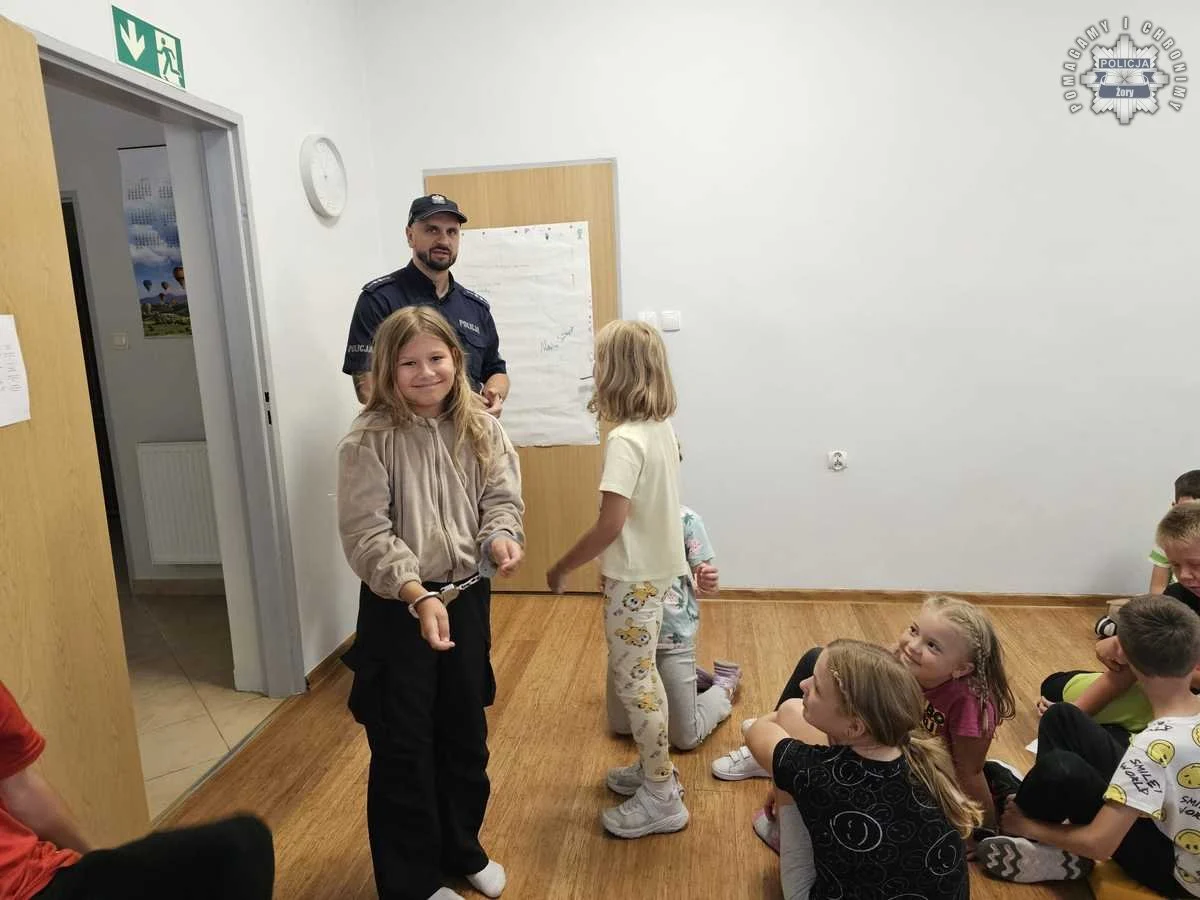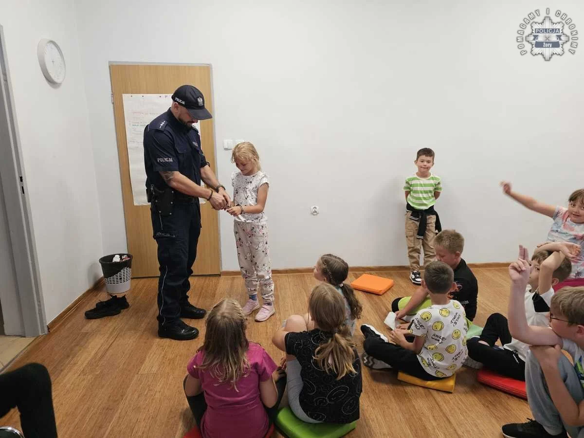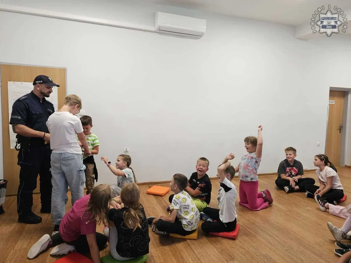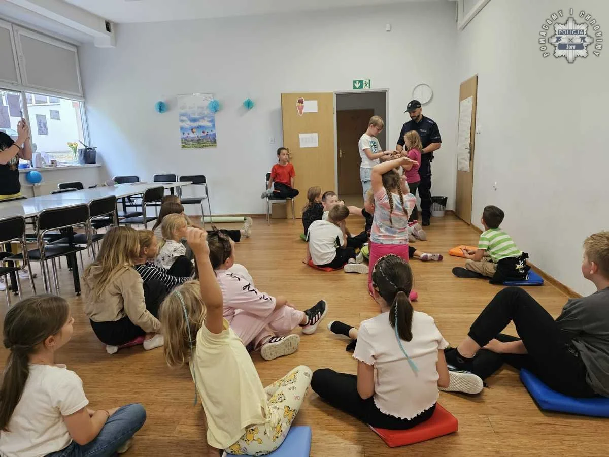 Wizyta policjanta w Żorach – dzieci uczą się zasad bezpieczeństwa na wakacjach