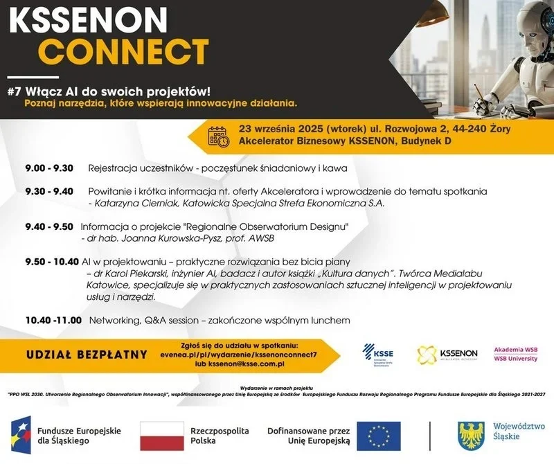 Zapraszamy wszystkich przedsiębiorców i osoby zainteresowane wykorzystaniem sztucznej inteligencji (AI) w swojej pracy na bezpłatne szkolenie poświęcone praktycznym rozwiązaniom AI w projektowaniu. Spotkanie odbędzie się 23 września 2025 r. w siedzibie Akceleratora Biznesowego KSSENON w Żorach.
