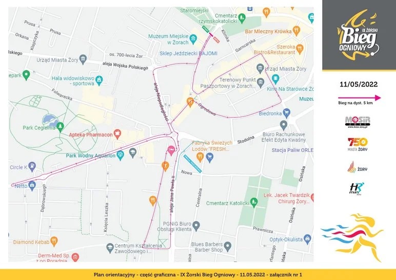 Uczestnicy w rozgrzewającej atmosferze Święta Ogniowego przemierzą uliczkami miasta trasę o długości 5 km. Biegacze staną na linii startu w środę, 11 maja o  godzinie 22:30. Po raz pierwszy będzie ona umiejscowiona w nowej lokalizacji – przy ul. Męczenników Oświęcimskich.