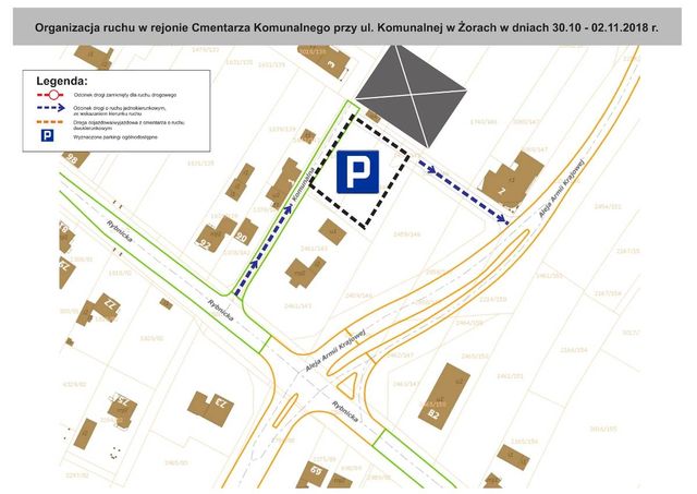 Cmentarz Komunalny przy ul. Komunalnej – wprowadzony zostaje ruch jednokierunkowy na ul. Komunalnej. Wjazd na parking przy cmentarzu będzie możliwy od ul. Rybnickiej, natomiast wyjazd w stronę al. Armii Krajowej.