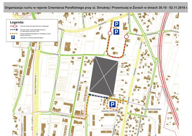 Cmentarz Parafialny przy ul. Smutnej i Prawniczej – Smutna zostanie zamknięta na odcinku od wjazdu na parking do skrzyżowania z ul. Nową. Dojazd do cmentarza od strony ul. Smutnej będzie możliwy tylko do parkingu. Ponadto wprowadzony zostanie ruch jednokierunkowy na ul. Prawniczej na odcinku od parkingu przy bloku nr 6 os. Korfantego do skrzyżowania z ul. Sądową. Kierujący mają możliwość wjazdu na parking od strony ul. Osińskiej, natomiast wyjazd będzie możliwy ul. Prawniczą w stronę ul. Sądowej.