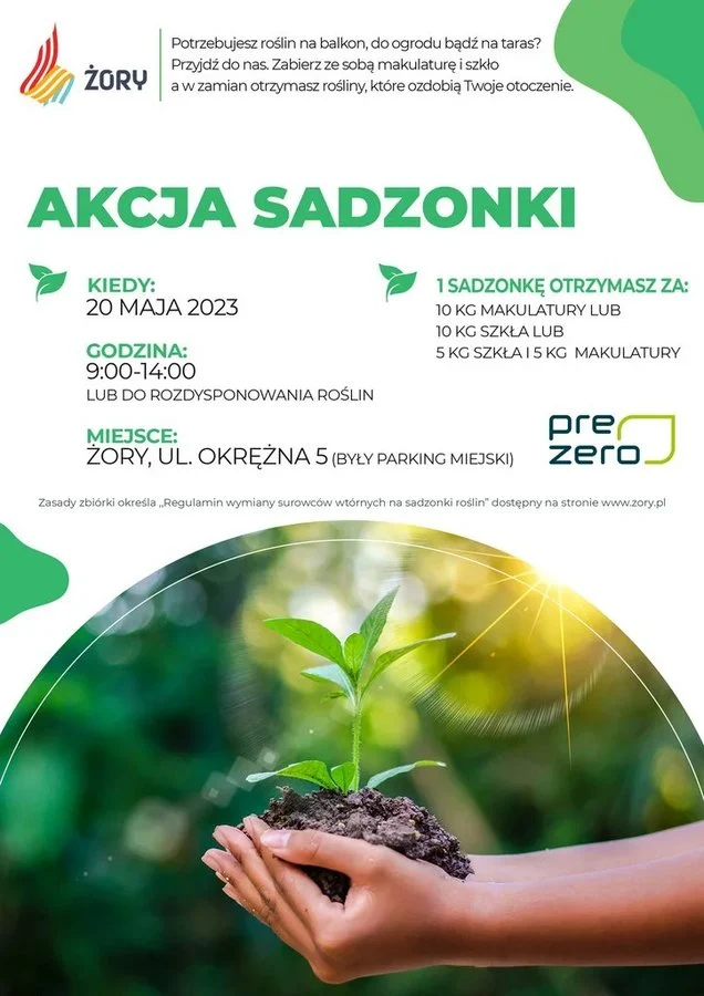 W sobotę 20 maja br. w Żorach odbędzie się Akcja Sadzonki. Makulatura i szkło to surowce, które będzie można wymienić na sadzonki kwiatów, krzewów i drzew.