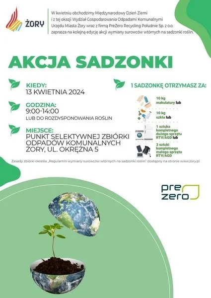 Potrzebujesz roślin na balkon, taras lub do ogrodu? Weź udział w Akcji Sadzonki! Wymień makulaturę, szkło czy sprzęt RTV/AGD na rośliny, które ozdobią Twój dom… W kwietniu obchodzimy Międzynarodowy Dzień Ziemi i z tej okazji Wydział Gospodarowania Odpadami Komunalnymi Urzędu Miasta Żory wraz z firmą PreZero Recycling Południe zaprasza na kolejną edycję wymiany surowców wtórnych na sadzonki roślin.