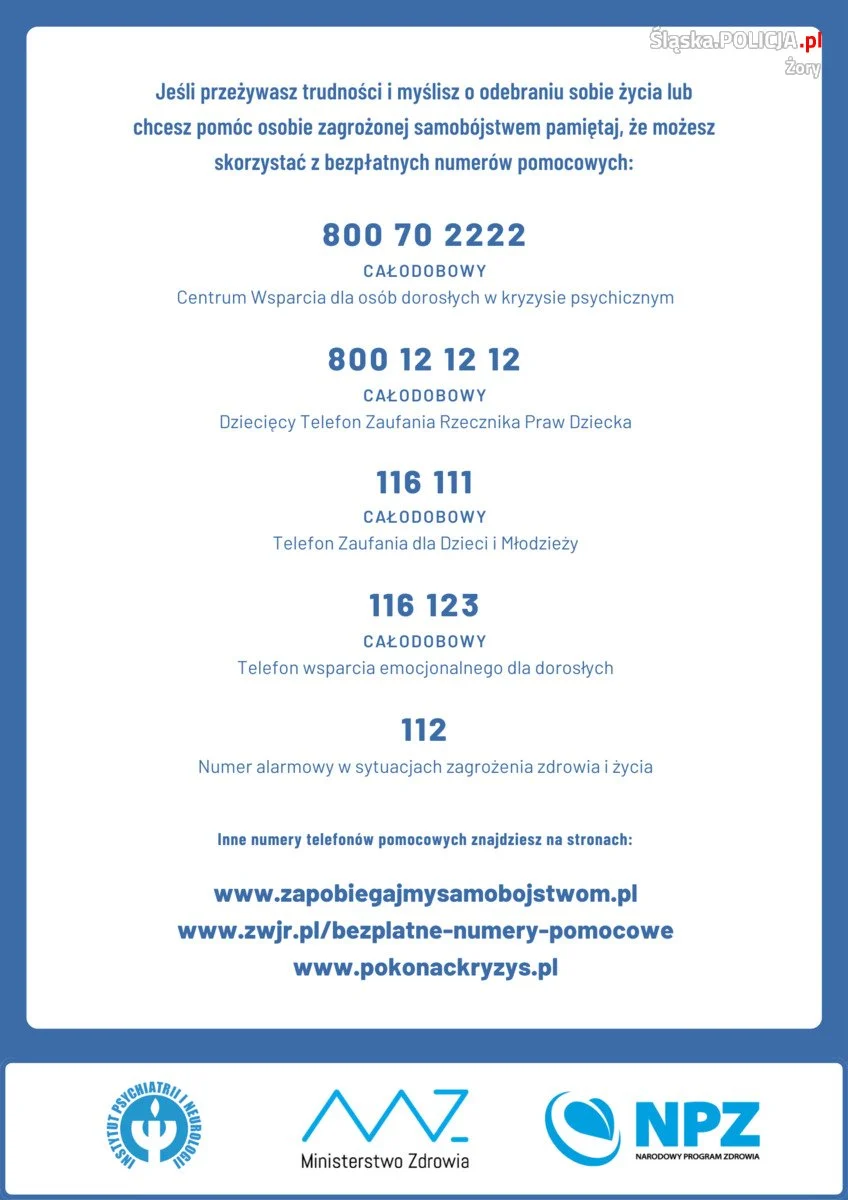 Przypominamy również numery, w których osoba znajdująca się w kryzysie psychicznym może uzyskać właściwą pomoc: