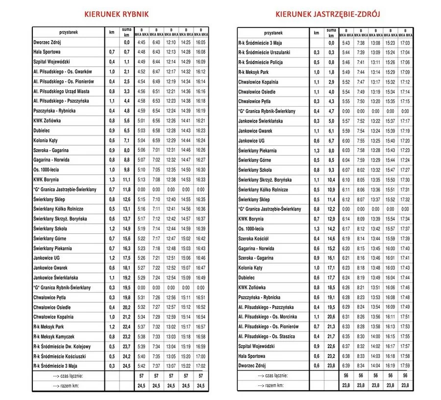 Generalnie autobusy będą kursować w pętli, a więc zaraz po przyjeździe do Rybnika wyruszą w kierunku powrotnym. Wyjazdy z „Dworca Zdrój” w Jastrzębiu zaplanowano na godz.: 4.45; 6.40; 12.10; 14.25; 16.05, natomiast z przystanku „Rybnik Śródmieście 3 Maja” wyjadą w kierunku Jastrzębie w godz.: 5.43; 7.38; 13.08; 15.23 i 17.03. Najważniejszym celem przy ustalaniu rozkładu jazdy było umożliwienie pasażerom dojazdu do szkoły i pracy.