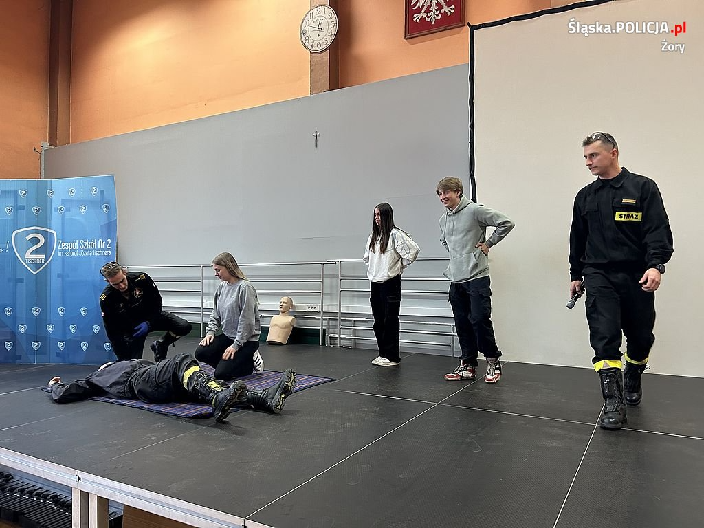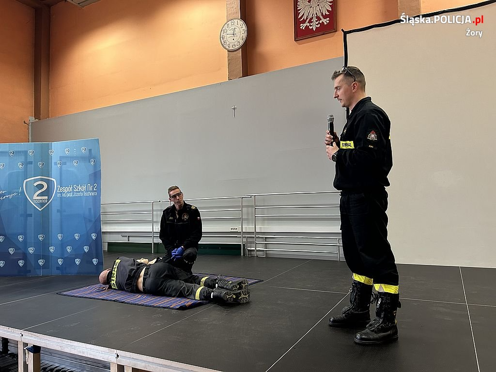 Strażacy Komendy Miejskiej Państwowej Straży Pożarnej w Żorach zwrócili uwagę na współpracę z mundurowymi w trakcie realizacji wspólnych akcji ratunkowych oraz przypomnieli o najważniejszych zasadach udzielania pierwszej pomocy. To właśnie szybka i profesjonalna pomoc ma wpływ na zminimalizowanie skutków zdarzeń drogowych i codziennych sytuacjach, w których niezbędna jest szybka pomoc.