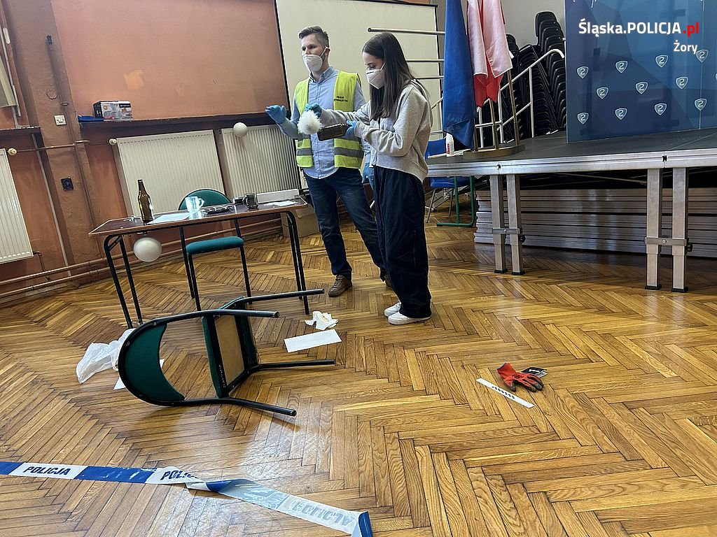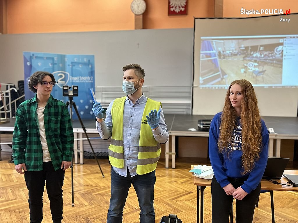 Następnie aspirant Grzegorz Marecik przedstawił młodzieży, kim jest technik kryminalistyki, co go cechuje i jak wyglądała jego codzienna służba. To właśnie atrybutem jego pracy jest aparat fotograficzny oraz walizka, w której wnętrzu znajdują się między innymi różnego rodzaju narzędzia, proszki do ujawniania śladów, specjalistyczne pędzle, zestawy do pobierania materiału genetycznego oraz do zabezpieczania śladów ujawnionych na miejscu zdarzenia. Prócz klasycznych narzędzi współczesnej kryminalistyki młodzież mogła zapoznać się ze skanerem 3D, który Wydział Ruchu Drogowego KWP w Katowicach wykorzystuje do zabezpieczania miejsc katastrof, a także zdarzeń kryminalnych.