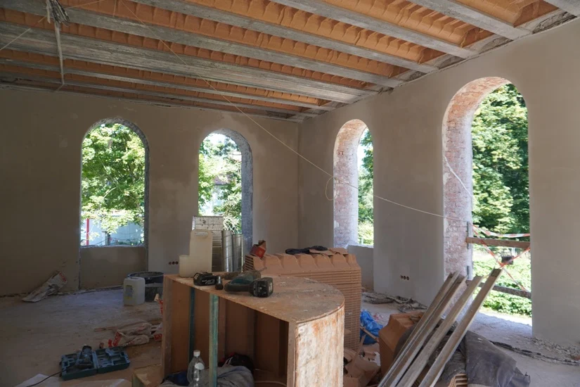 Obecnie trwają prace murarskie i żelbetowe na poziomie piętra i poddasza, zakończono montaż nadproży nad przebiciami i otworami drzwiowymi. Otwory okienne zostały znormalizowane do odpowiednich wymiarów. Wykonano wzmocnienia ścian zewnętrznych, wewnętrznych oraz elewacji za pomocą spiralnych prętów ze stali nierdzewnej i specjalnych zapraw oraz wykonano szkielet z profili stalowych ocynkowanych dla ścianek działowych na parterze i poddaszu. Elewacja pałacu wymagała wielu zabiegów m.in. skuwania, piaskowania, czyszczenia, uzupełnienia ubytków, a miejscami pogrubienia tynków. Konieczne było również odtworzenie gzymsów poprzez nakładanie poszczególnych warstw, aż do uzyskania należytych wymiarów oraz wykonanie nowych gzymsów w miejscach ich całkowitych uszkodzeń lub braków.