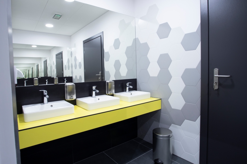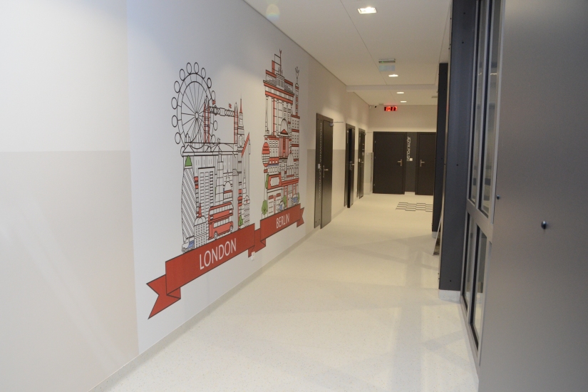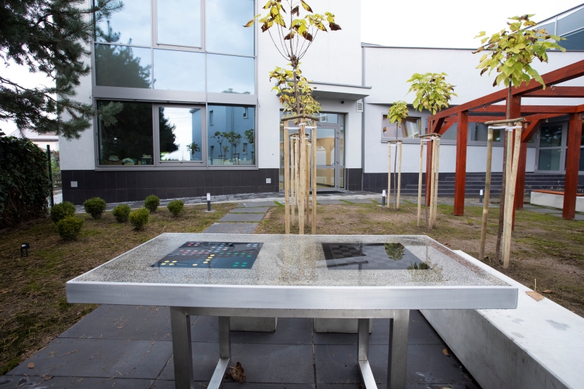 Na uwagę zasługuje bez wątpienia zagospodarowanie terenu wokół placówki: zyskała ona dwie przestrzenie otwarte (tzw. patio), w których planowana jest organizacja przerw międzylekcyjnych na świeżym powietrzu.