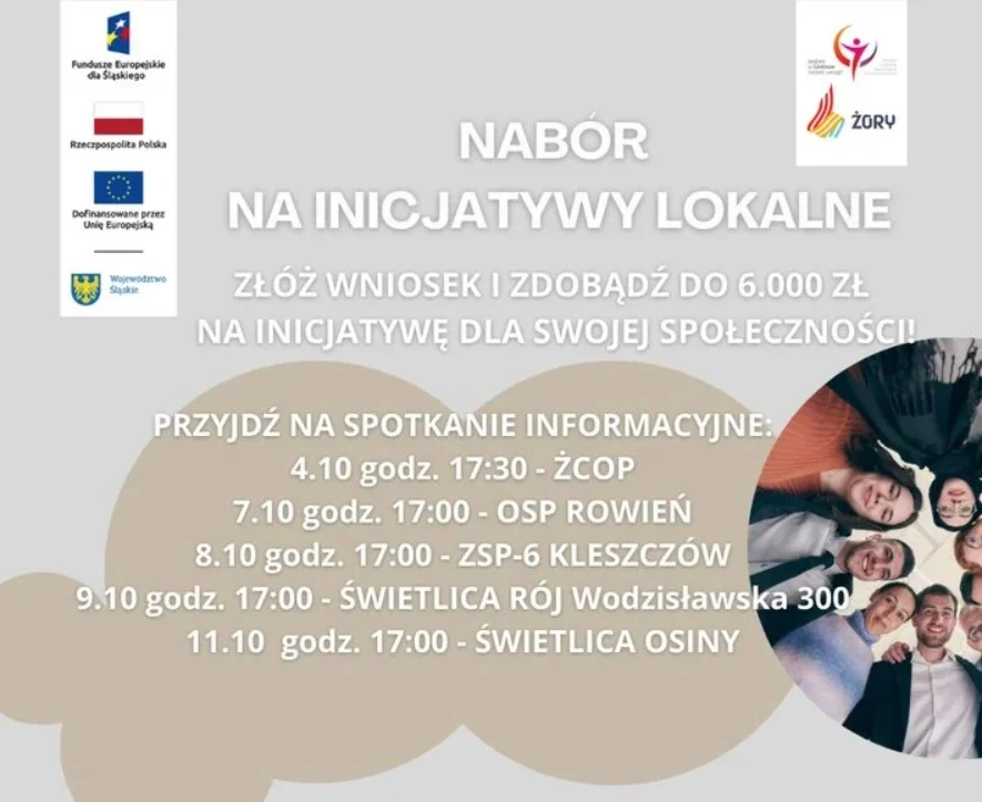 W październiku w Żorskim Centrum Organizacji Pozarządowych rusza nabór na inicjatywy lokalne, a od 4 października br. ruszają spotkania informacyjne dotyczące naboru. Nie może Was zabraknąć na jednym ze spotkań w pięciu dzielnicach naszego miasta!