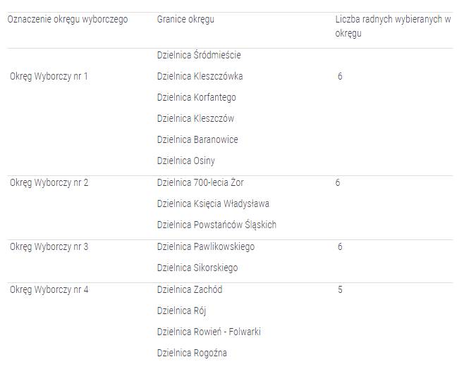 Obecnie podział Żor na okręgi wyborcze przedstawia się następująco: