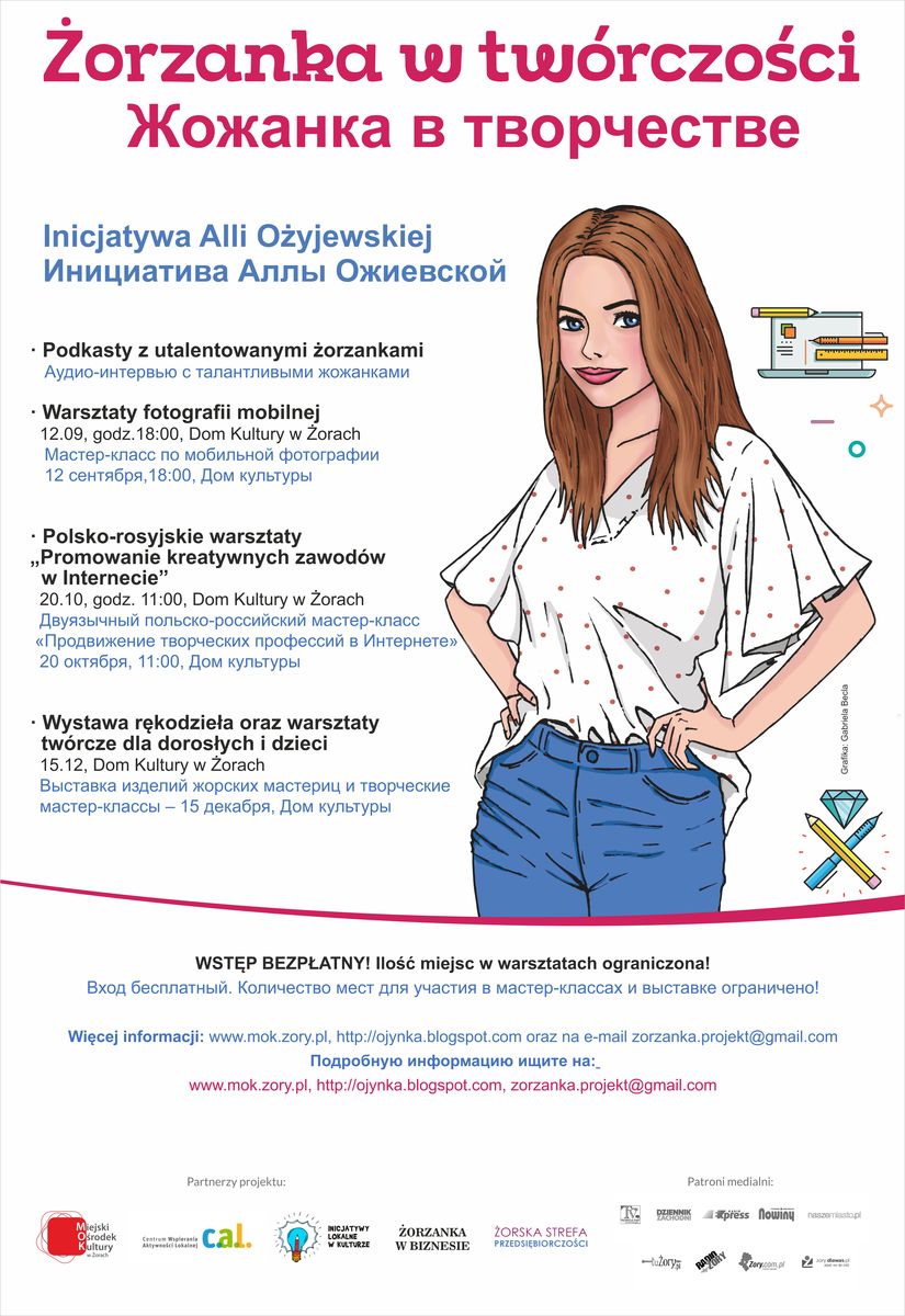 Zastanawiałam się nad tym, jak zaangażować moich rodaków oraz innych imigrantów rosyjskojęzycznych w społeczne i kulturalne życia miasta. Ponieważ wiem, że dużo z nich ma problem z adaptacją za granicą, nawet te osoby, które podjęły świadomą decyzję o stałej przeprowadzce, np. repatrianci. Często ich świat ogranicza się do pracy, domu, wizyty w sklepie i relacjami online z osobami z byłego otoczenia – mówi Alla Ożyjewska. – Postanowiłam, że muszę postarać się zintegrować ich z rodowitymi żorzanami, zachęcając do wzięciaudziału w projekcie „Żorzanka w twórczości”. Chcę odnaleźć osoby utalentowane, pokazać te talenty i reaktywować ich życie społeczne. Dlatego robimy materiały promocyjne także w języku rosyjskim, organizujemy specjalne dwujęzyczne warsztaty etc. Chcę, żeby Żory naprawdęstały drugim domem dla tych ludzi, jak stały się dla mnie – dodaje.