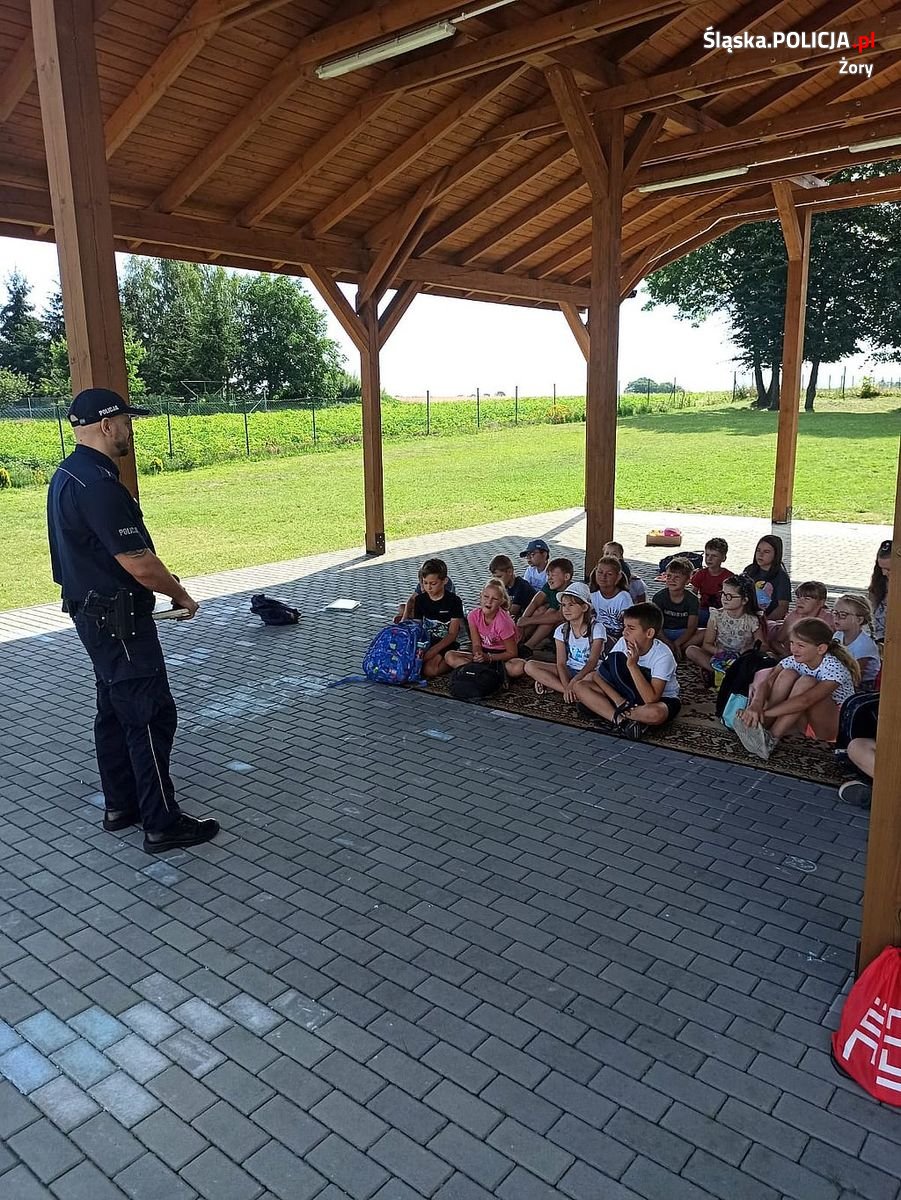 O zasadach i sposobach na bezpieczne wakacje rozmawiał dziś z dziećmi profilaktyk żorskiej Policji.