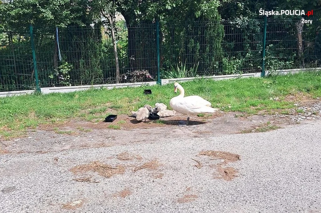 W minioną środę około godziny 14:30 dyżurny Komendy Miejskiej Policji w Żorach otrzymał wezwanie, iż łabędzica wraz ze swoimi łabędziątkami wybrała się na spacer.