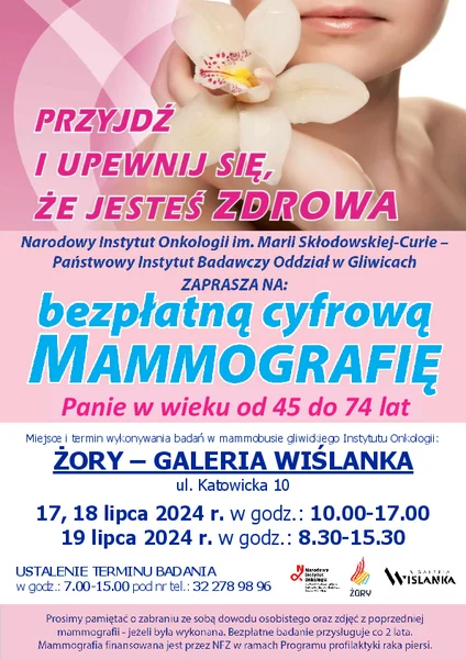 Przy Galerii Wiślanka przez trzy dni będzie stał specjalistyczny mammobus. Kobiety w wieku 45-74 lat będą w nim mogły bezpłatnie wykonać cyfrową mammografię. Warto zadbać o swoje zdrowie i wziąć udział w badaniu!