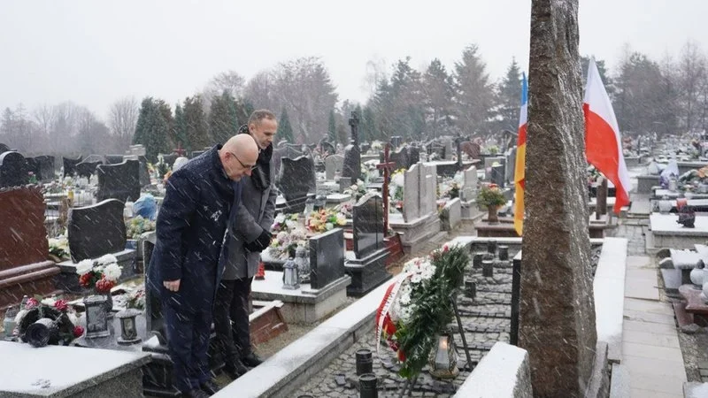 Przedstawiciele władz miasta Żory: Daniel Wawrzyczek – Zastępca Prezydenta Miasta Żory oraz Kamil Owczarek – Wiceprzewodniczący Rady Miasta Żory uroczyście złożyli kwiaty na zbiorowej mogile 23 więźniów KL Auschwitz poległych podczas „marszu śmierci” 17 stycznia 1945 r., znajdującej się na cmentarzu parafialnym przy ul. Nowej.