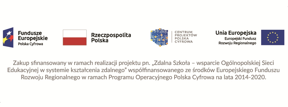 Projekt pn. „Zdalna Szkoła + w ramach Ogólnopolskiej Sieci Edukacyjnej” jest finansowany ze środków Programu Operacyjnego Polska Cyfrowa na lata 2014-2010, Oś Priorytetowa nr I „Powszechny dostęp do szybkiego Internetu”, Działanie 1. 1: „Wyeliminowanie terytorialnych różnic w możliwości dostępu do szerokopasmowego Internetu o wysokich przepustowościach”.