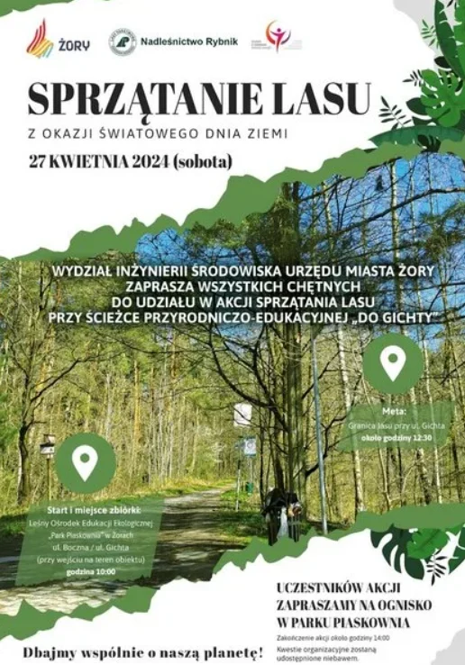 Akcja sprzątania lasu odbędzie się w sobotę, 27 kwietnia. Początek o godzinie 10:00. Zbiórka przy wejściu na teren Leśnego Ośrodka Edukacji Ekologicznej „Park Piaskownia” w Żorach. Podczas akcji będą odbywały się konkursy ekologiczne z nagrodami. Miasto Żory zapewnia uczestnikom worki na śmieci oraz rękawice i pamiątkowe podziękowania.